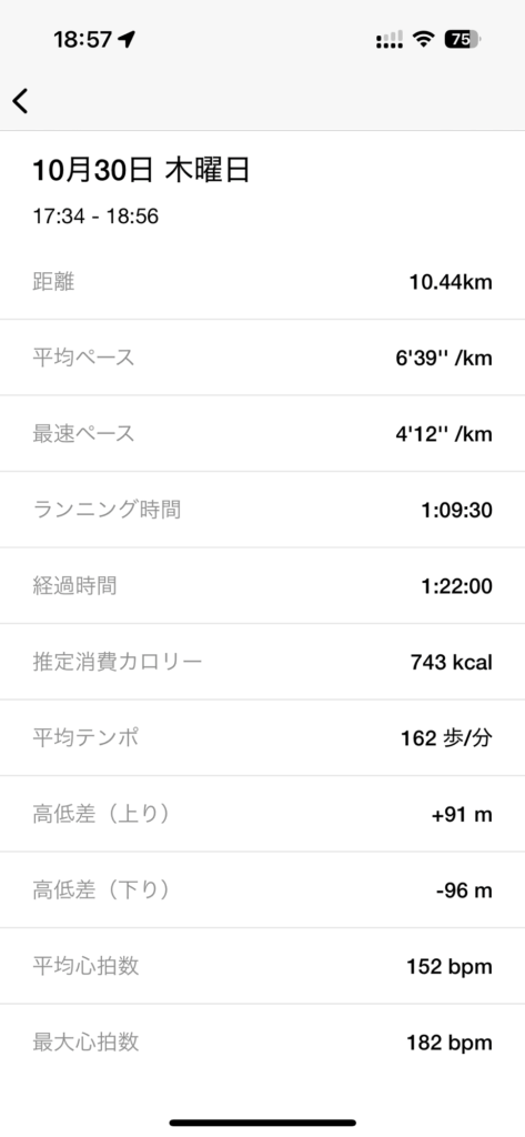 木曜日は前日にだいぶ飛ばして走ったこともありペースが上がりきらなくて1キロ毎に歩いてしまった印象があります。